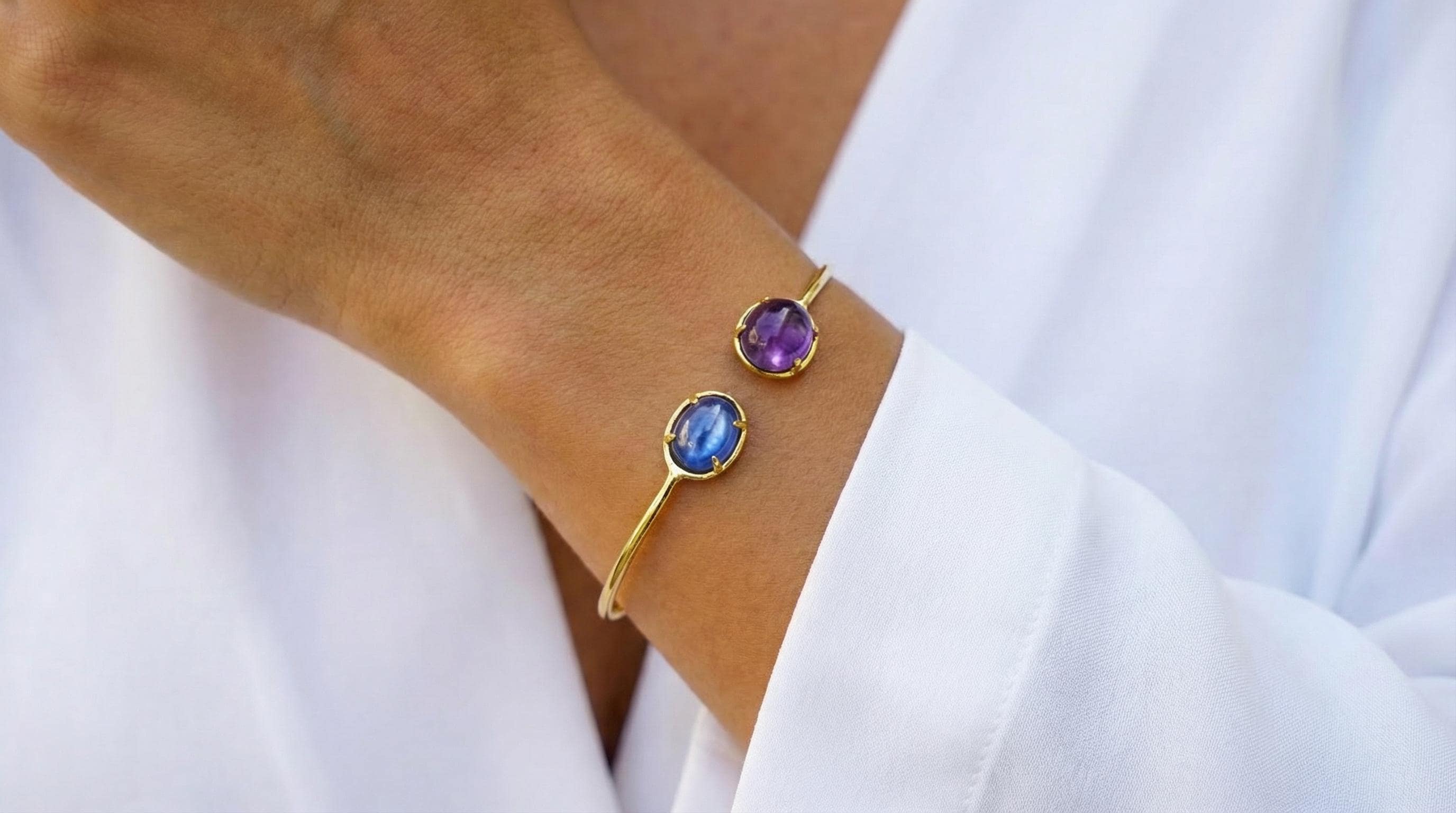 This exquisite 14K Gold Amethyst Bracelet is a perfect blend of luxury and sophistication, designed to be both a striking accessory and a meaningful addition to your jewelry collection. Featuring two stunning amethyst stones, this bracelet showcases the rich, vibrant hues of the gems beautifully set in high-quality 14K gold.