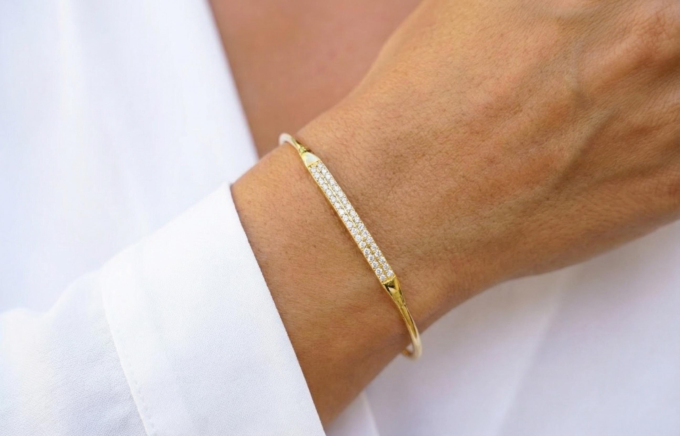Add a touch of understated luxury to your style with this elegant gold cuff bracelet, featuring a sleek bar detail encrusted with sparkling cubic zirconia. Its minimalist design makes it a standout piece β ideal for layering or wearing on its own for a refined, everyday look.
