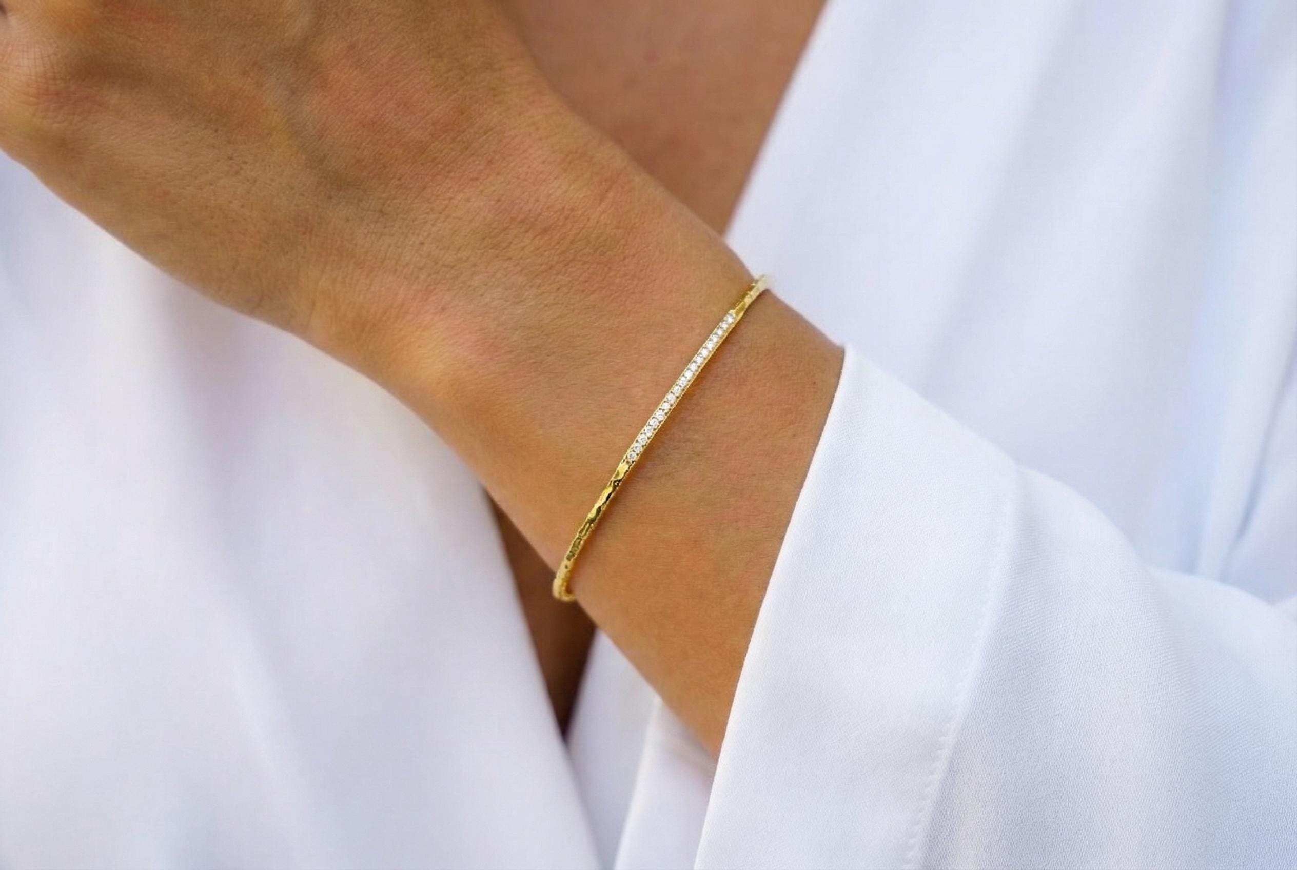 Show off your style with this elegant 14K gold bracelet, featuring a delicate bar set with sparkling zircons or VVS1 diamonds — depending on your choice. The bar’s clean line and minimal design make it perfect for everyday wear or for layering with other bracelets.